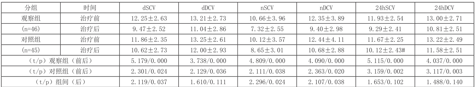 治疗后两组 dSCV、dDCV、nSCV、nDCV、24hSCV、24hDCV 较治疗前降低(P