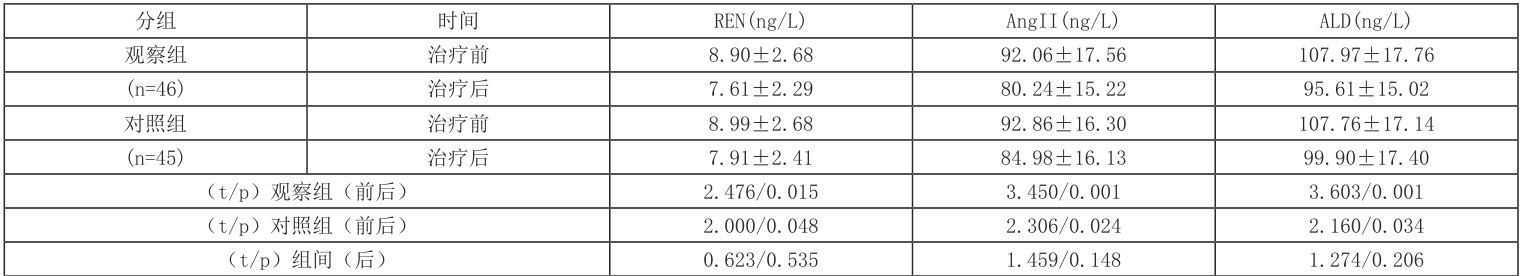 ),其中观察组AngII、ALD 水平降低更明显( P<0.01⟩ ),详细见表2。