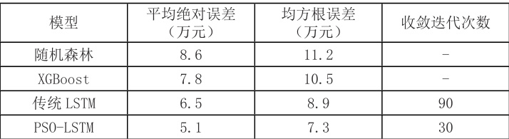 将 PSO-LSTM 与随机森林、XGBoost、传统 LSTM 对比,结果如表 2 所示。PSO-LSTM 平均绝对误差 5.1 万元,较传统 LSTM 降低 21.3%,收敛迭代次数 30 次,仅为传统 LSTM 的 1/3 ,在预测精度与效率上均最优,证明超参数优化的有效性。