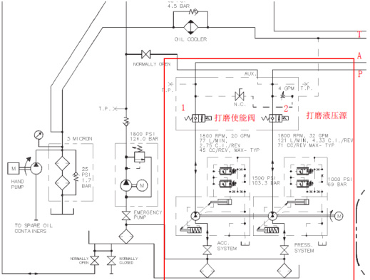 打磨压力源是由一个 22kW 的异步电机驱动两个液压泵提供整个打磨系统的液压动力,如图 1 所示,其中背压源的压力为 103.3bar,正压源的压力为69bar。