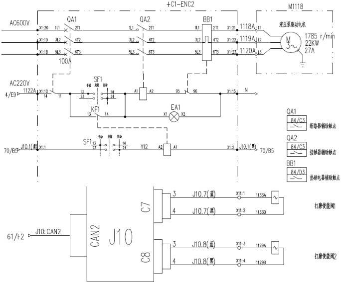 打磨使能阀 1 和 2 的控制是与打磨泵电机的启停控制相关联,而启停控制的命令是由上位机发送到底层模块的。打磨泵电机能否正常运转除了受上位机的控制之外,还与发动机的启停相关联,因为由图 3 可以看出打磨泵电机的供电电压是AC600V,这个电压源是由主发动机驱动的主发电机提供的。
