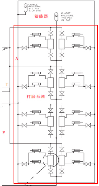每一节打磨车有 16 个打磨电机,P 管正压油通过打磨阀组作用下压油缸的无杆腔,再由 T 管回油,同时与一个提供压力为 51bar 的蓄能器相连;A 管背压油直接与一提供压力为57.9bar 的蓄能器相连,如图2 所示液压原理。