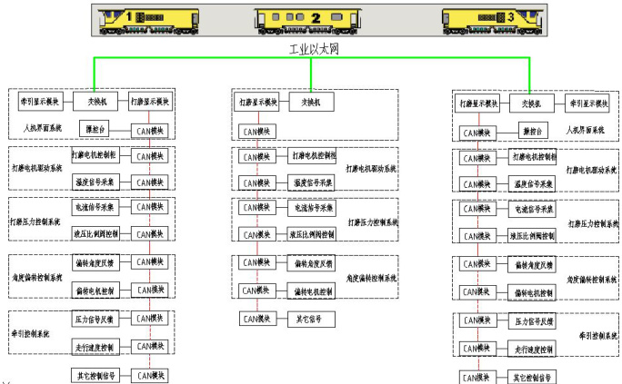 PGM-48 型打磨车的网络架构分为两层,车与车之间的数据是采用以太网传输,本车之间的数据是采用CAN 总线传输,整车的网络架构如图5 所示。
