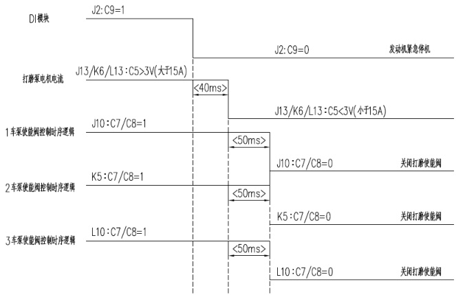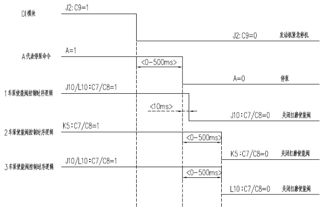 发动机紧急停机有一个状态信号,由操控台内部的 DI(数字量采集)模块采集,通过 CAN 总线输出到人机显示模块,显示模块接收到紧急停机信号经过运算处理下发一个打磨泵电机停止的命令,在本车通过 CAN 总线下发到底层 DO 模块 J10,执行泵电机停止命令:J10:C7=0 和 J10:C8=0,延时 5s 后,J10:C1=0 ;同时还要将打磨泵电机停止的命令通过以太网传输到它车,执行泵电机停止命令,具体的时序见图6 所示。