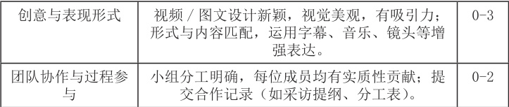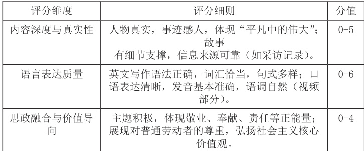 任务示例:以第三单元“Heroes of our time”为例,学生分组开展实践活动,选择身边的“平凡英雄”(如志愿者、环卫工人等)进行采访,并以此为基础完成一段3-5 分钟的英语短视频。同时,小组需提交《项目过程记录表》,包括采访内容和成员分工说明等。思政融合点:让学生讲好中国故事,探索平凡中的伟大。