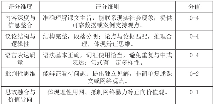 活动设计:使用iwrite 平台发布作业,要求学生选择一篇课文或课外文章进行批判性阅读并撰写读后感。作业示例:请结合第四单元课文 Social Media Matters 的内容,查阅相关英文资料,撰写一篇200 词左右的议论文,探讨社交媒体