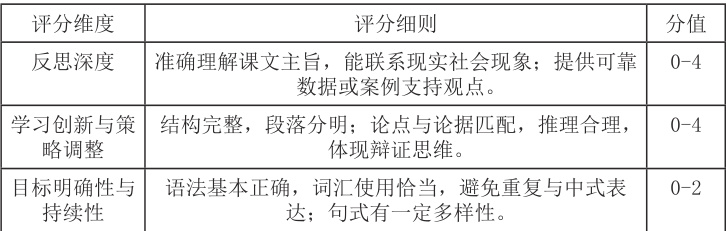 创新性,顾名思义,是强调考核评价体系在内容与形式上的不 断变 与创新。 在大数据时代背景下,我们可以在评价体系中融合信息技术。例如,可以借助“u 校园”等智慧平台,对学生学习过程进行管理和监测,对其学习行为数据进行分析,从而调整后续学习计划。同时,我们也可以应用iWrite”等智能写作系统,可提升评价的客 可以采用系统自动评价、同伴互评、教师评价等多种评价方式,从而确保评价的科学性和准确性。同时,评价形式也可以实现创新 例如可以采用项目式学习(PBL)、角色扮演、推文创作、视频制作等多样化任务,鼓励学生在开放性真实性的情境中进行 也可以设计一些跨文化情境,提升学生的思辨能力,培养学生的开放性思维和批判性思维,更有利于促使学习从“语言知识能力掌握”向“认知思维能力”的转变。