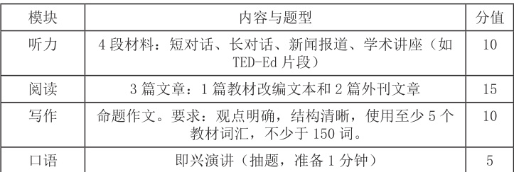 终结性评价考核采用笔试与口语面试相结合的方式,既覆盖教材核心内容,也引入外部语料,确保语言能力与思维素质的综合评估。可结合“u 校园”发布听力音频、阅读材料与写作任务,口语部分需线下组织。该项目评分标准加下表