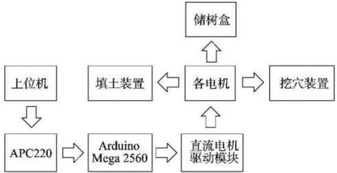 Arduino Mega 2560 :下位机主控板,解析指令、控制电机,协调各装置作业直流电机驱动模块:放大主控板信号,为挖穴、填土等电机提供适配功率。