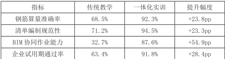 学生职业技能显著提升:学生对造价软件(如广联达 GTJ、GCCP)的操作熟练度、识图能力、工程量计算准确性、清单编制规范性等核心技能考核优秀率明显提高 ,BIM 基础应用能力得到普遍加强。通过 XGBoost 算法构建能力预测模型发现学生在完成第 3 个典型任务后技能增速达峰值,角色扮演环节对沟通能力贡献率达 42.7% 。关键教学数据对比如下: