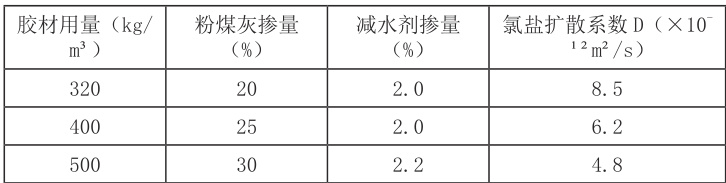为验证 C45 水下混凝土耐久性预测模型的可靠性,通过加速氯盐侵蚀试验获取多组参数数据,建立试验结果与模型核心参数的对应关系。试验选取胶材用量、粉煤灰掺量、减水剂掺量为变量,测定不同配比下的氯盐扩散系数,结果如表1 所示。