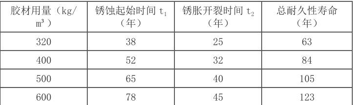锈蚀起始时间 t1 采用 Fick 第二定律推导公式计算: t1=(Ct2×x2) /( ⟨4×D× erfc⁻¹ (2Ct/Cs)2 ),其中 Ct 为钢筋表面临界氯离子浓度(取 0.4% ), x 为保护层厚度(取 50mm), D为氯盐扩散系数(表1数据), Cs 为表面氯离子浓度(取3.0% )。以胶材用量 500kg/m3 为例,代入 D=4.8×10-12m2/s ,计算得 t1=65 年,与模型预测一致。