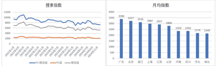2022 年 -2024 年“肝移植”月均搜索量整体呈缓慢下降趋势(图 1)。存在明显季节性波动,2 月(春节期间)降至谷底,3-5 月及9-11 月出现小高峰。移动端搜索占比持续超过 80% 。