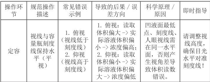 实验过程中,学生常因对操作规范细节把握不准或遗忘而导致误差(如定容时视线不水平、转移溶液洒落、未用玻璃棒引流)。传统教学中,教师巡视指导覆盖面有限,难以及时发现并纠正所有问题。以“配制一定物质的量浓度的溶液”实验为例,利用 AI 生成实时操作对比表格进行精准辅导,建立标准操作库与常见错误库:梳理本实验的关键操作环节(如“天平称量”、“溶解转移”、“定容”)的标准操作规范及对应的典型错误操作。
