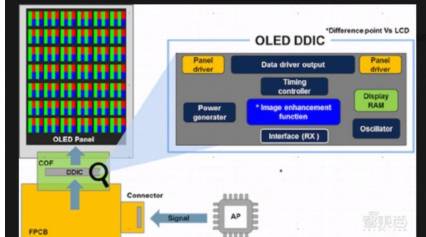 驱动芯片(如图 2)是整个 OLED 模组的“神经中枢”,负责将外部图像信号转化为可驱动 OLED 面板发光的电信号,协调显示控制、信号处理、画质优化等核心功能,直接决定模组的显示效果、响应速度和可靠性。驱动芯片包括以下几大功能:信号转换与解析、像素驱动与亮度控制、时序同步与扫描控制、画质优化与功能扩展和保护。