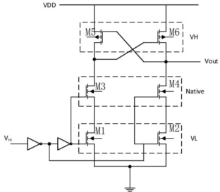 为节省驱动芯片的面积和降低功耗,会尽可能的采用低压器件进行数据处理和转换,但为了驱动 OLED 发光管,需要进行电压转换,电压跨度越大转换信号质量的要求越高,高速转换的难度也越大。传统电平转换单元需串联两个模块实现低压到中高压逻辑信号的逐级转换,导致时间延迟大、功耗高,且需大尺寸 MOS 管,占用面积大。由于需要考虑输入电压的竞争,需要调整 MOS 管的尺寸来调整 NMOS 和 PMOS 的下拉与上拉能力,如图 13 所示,M1-M6 会数倍于最小尺寸,造成layout 上的成本增加,以及RC 传输延迟增加。