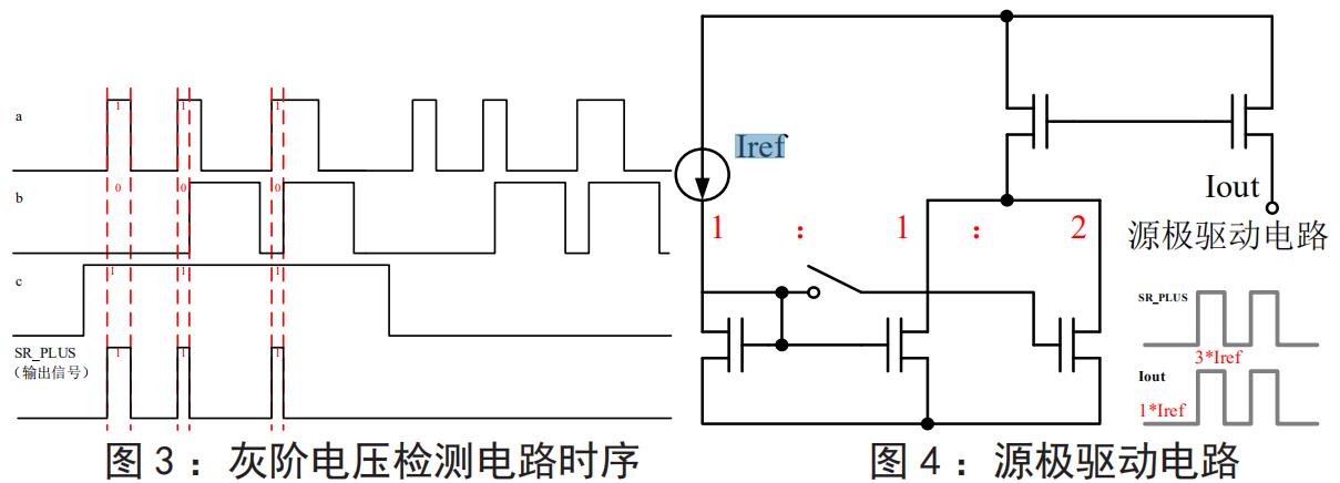 灰阶电压检测电路的时序如图 3 所示,其中信号 a 为源极驱动电路状态改变时增大整体电流的信号;b 为源极驱动电路输出灰阶电压给显示屏的信号;c为灰阶加速电路的总控制信号,通过逻辑运算得到输出信号 SR_PLUS。通过该模块对源极驱动电路和电流加倍电路进行控制,即在源极驱动电路的灰阶电压切换时进行相应操作,其中电流加倍电路的目的是补偿源极驱动电路中输入差分对减少带来的电流减小。