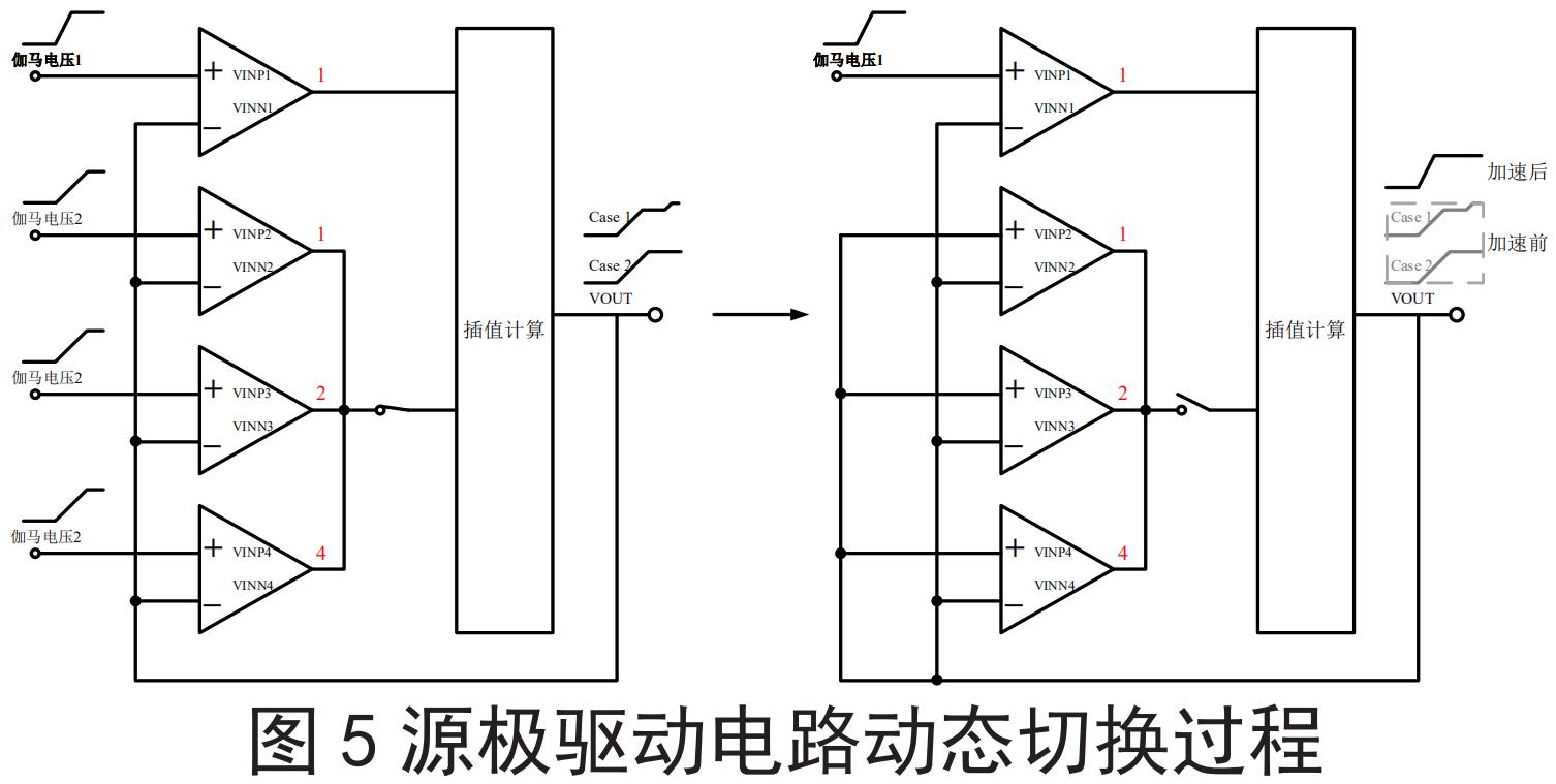 源极驱动电路由灰阶加速电路、四组输入差分对与插值输出级组成,动态切换电路如图 5 所示。当源极驱动电路处于写入电压的状态时,输入差分对中的 VIN/P2~4 与伽马电压断开并与源极驱动电路的输出短接进行预充,此时VIN2~4 可保证与 VIN1 几乎一致的摆率。当输出端完成灰阶电压的建立后,所有输入差分对接回伽马电压时源极驱动电路开始计算电压插值,由于插值的两个输入电压差很小( ⟨10mV⟩ ),插值电压的建立时间远远短于输出端灰阶电压的完整建立时间。
