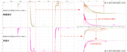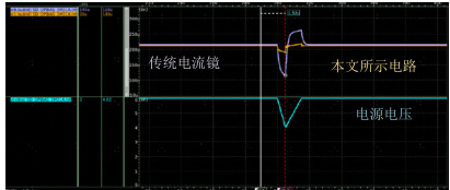 的电路仿真结果显示,在电源电压发生微秒级的下降时,本文所用电路的镜像电流的下降幅度是普通电流镜的 20% ,仅为目标电流的 11%,而普通电流镜下降到目标电流的 54% ,SR=Imax/Cc。在高刷显示芯片的驱动电路中,运算放大器的 slewrate 通常在 10V/1us 级别,输出信号的驱动通常在 1us 内完成,驱动电流在此过程下降会造成驱动速度的显著变慢,这在高刷新率的驱动电路里会造成驱动速度的明显变慢,造成屏幕变暗(如图 12 )。