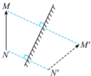 或通过平面镜性质得出,由 MN 两点分别向平面镜作垂直线,以平面镜面为中心线,取右侧垂直线段与左侧 m 点到镜面相等距离的点即为 m',n 点同理取n',连接m'n' 则得出平面镜对应的虚像。