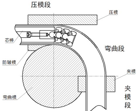 数控弯管成形原理如图 1 所示。弯曲模固定在机床主轴上并随主轴一起旋转,管件的一端由夹块压紧在弯曲模的镶块上,在管件与弯曲模切点附近外侧装有压块,内侧装有防皱模,管件内部有芯棒与芯头支撑,当弯曲模绕机床主轴转动时,管件就绕弯曲模逐渐弯曲成形。