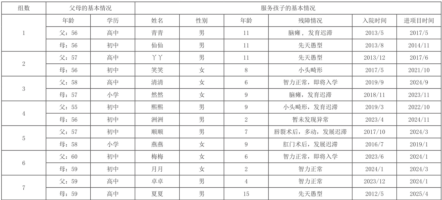 (一)“类家庭”父母的年龄均在 55—60 岁之间,小学学历占 14.3% ;初中学历占 42.9% ;高中学历占42.9%,由此可看出,父母的学历主要集中在初高中,基本可以完成辅导孩子作业、辅助孩子基本康复,但“教育”方面还存在短板,特别是心理关爱、情感支持、情绪疏导方面,要加强指导和知识普及。