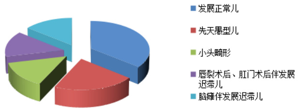 (二)“类家庭”中照拂的 14 个孩子,年龄层次不齐,最小的 2 岁,最大的 15 岁,其中 85.7% 的孩子有在机构集中供养的经历;经格塞尔发展量表及韦氏量表筛查,智力正常的孩子 5 名,占研究对象的 35.7%,发展迟缓儿童9 名,占研究对象的64.1% ;其中,先天愚型儿3 名;小头畸形儿2 名;唇裂术后、肛门术后伴发育迟滞儿各1 名,;脑瘫伴发展迟缓儿2 名。如下图: