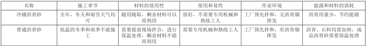 表1 冷铺沥青砂与普通沥青砂的性能特点对比
