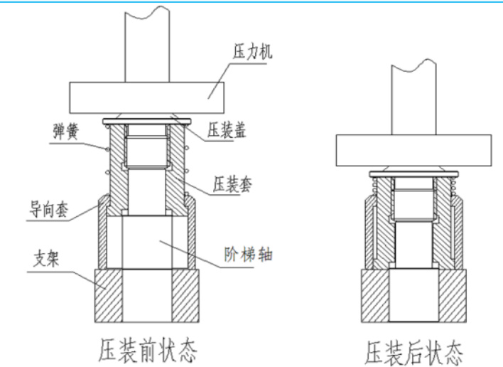 1. 用目测的方法,无法保证阶梯轴与支架孔压装时的垂直度要求。2. 在压装过程中,无法保证阶梯轴一次压装后的高度尺寸精度(需反复测量并多次调整垫片厚度)。3. 阶梯轴在压装过程中出现歪斜(会导致阶梯轴、支架损坏或报废),施工质量无法得到保证。