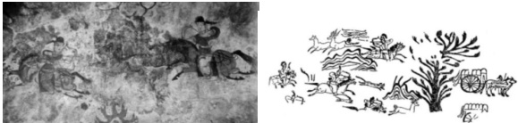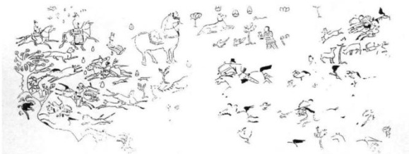 药水里墓的山林狩猎图(图4)绘在前室西壁上部,山林中有十多位猎手隐藏其间,向外张望,随时准备出击。山林下部绘着骑马射猎的画面,左侧两位张弓搭箭的猎手追射逃窜的野兽,野猪、鹿、虎、兔仓惶逃遁。右面有十几位骑在马上的猎手张弓搭箭,朝着逃来的野兽进行围猎,下面还有骑马的猎人准备射猎。
