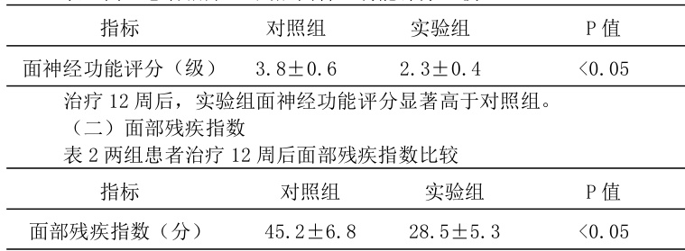 表 1 两组患者治疗 12 周后面神经功能评分比较