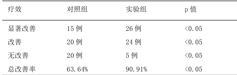 实验组头痛、头晕、乏力等临床症状总改善率为 90.91% ,明显高于对照组的 63.64% ( (P/0.05) )。