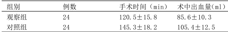 观察组手术时间为( (120.5±15.8) )min,对照组为( 145.3±18.2) )min,观察组手术时间显著短于对照组( t=5.68 , P<0. 05⋅ );观察组术中出血量为(