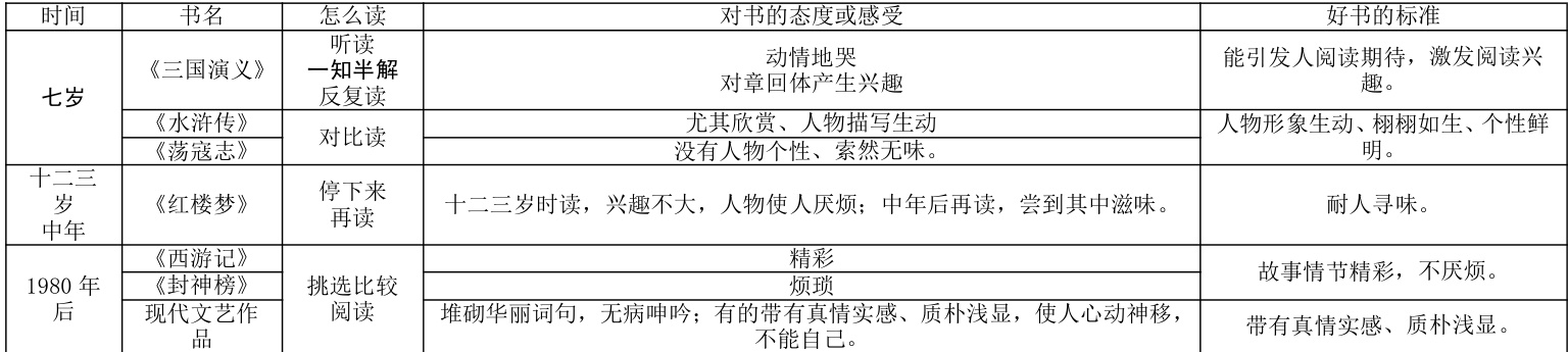 本课内容较多,信息量比较大,学生初读过后能够大致梳理课文信息,把握具体内容,知道作者的读书经历,以及作者认为的好书标准。但是可能会出现缺漏信息或者提取不准确的情况。如,学生很容易找到作者阅读《红楼梦》的时间是“十二三岁”,却容易忽略作者在“中年以后”仍然在读这本书;在找阅读书目时,学生容易忽略《荡寇志》这本书,需关注“没有人物个性”这句话,从而获知《荡寇志》也是作者读过的书籍之一。