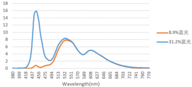 采用 2(蓝光含量: 8.9% 、31.2%) ×2 (亮度:21cd/m²、 140cd/m2 )两因素被试内设计。在不同蓝光和亮度水平下测量被试的反应时和错误率,并在每个block 后用问卷测量其对游戏的主观心理渴求度,不同block 之间进行 ABBA 设计以平衡顺序效应。通过 Photokit 软件调节 RGB 值控制蓝光比例,使用 HPCS-329 光谱照度计校准光谱参数(图 1),ST-86LA亮度计测量实际亮度。相关色温分别为 4008K(低蓝光)和 6638K(高蓝光)。