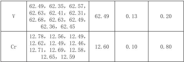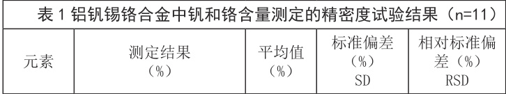 按照试验方法对铝钒锡铬合金试样独立测定 11 次,根据所得数据计算标准偏差 (SD) 及相对标准偏差 (RSD)。结果见表 1。表 1 表明:钒、铬测定结果的相对标准偏差分别为 0.20% 和 0.80% ,说明测定结果有较高的精密度。
