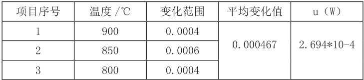 研究“煅烧温度”下的灰分不确定度时,可发现聚丙烯树脂灰分不确定度测量试验中,坩埚的煅烧环境为 800-900∘C ,因而可将煅烧变化温度设定成900∘C 、 850∘C 、 800∘C 等 3 种情况,再根据实际操作,科学测量上述温度下的聚丙烯树脂灰分含量,明确该含量变化范围,再确认灰分不确定度。表 2 全面展现了不同煅烧温度下灰分不确定度,明确灰分在不同温度中的变化状态,提升温度测算有效性 [1]。在开展聚丙烯树脂灰分不确定度测量试验操作中,要科学处理相关数值,依照平均值评定不同温度环境下灰分的有效性。当利用煅烧温度变化而获取灰分不确定度时,其计算公式为:平均变化值 /31/2 ,用 u(W)代表该不确定度。在全面探究不同温度下灰分不确定度变化值后,可精准计算灰分不确定度、平均变化值等,明确该要素下灰分不确定度判定标准,在实践操作中合理调整煅烧温度。