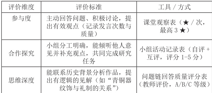 上述评价指向思维过程的 3 个阶段,逐步推进。参与度是前提,保证学生能进入思考过程。合作探究着眼于在合作中思考过程的交流( 倾听、补充、相互探究 )。思维的深度指明“联系史实”、“有逻辑的表述”,指向分析、联系、推理等高阶思维,如青铜器纹饰与礼制关系是深度学习的呈现。