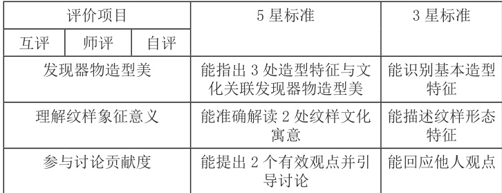在跨学科学习中设计整合性评价,考察学生运用多学科知识、视角与方法解决艺术问题的能力,可以促进系统性、关联性理解。在《中国工艺美术》这一欣赏课例中,学生探究学习的核心任务是“选择一类器物(陶 / 青铜 / 漆 / 瓷),制作《工艺美术作品解密档案》,阐释其如何承载文明(需融合美术、历史、科技三重视角)”。设计评价标准如下: