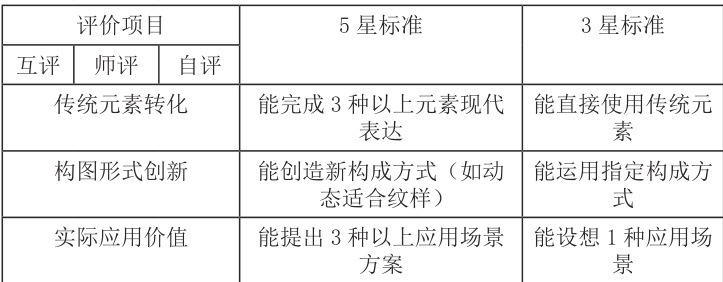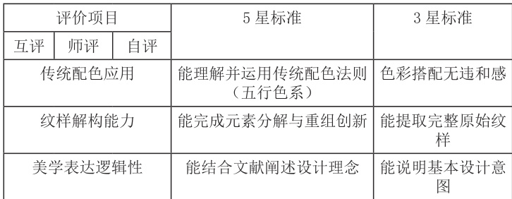 深入理解中国传统文化蕴意(比如蝙蝠= 福)。在评价标准上由不同等级促进知识迁移,如“能指明3 处造型特征与文化关联”(5 ★)“能辨别基本特征”(3 ★ ),“能准确阐释 2 处纹样寓意”(5 ★ )“能描述形态”(3 ★ )”,使学生能通过评价标准理解“形式→文化双重视角分析框架”,可迁移至对建筑、绘画等其他传统艺术的分析。任务 2 通过表现性任务“纹样解构”让学生了解“传统配色使用”,掌握“纹样解构”,学会“美学表述逻辑性”。评价标准强调“理解并创造转化”,如“使用五行法则”→调和色彩→掌握传统配色方法”。在配色方法的运用上可迁移到空间、数字媒体等领域,使其应用能力得到体现。任务 3 以“创新构思”的表现性任务为驱动,要求学生“把传统元素转换为抽象符号”(如青铜器饕餮纹威严感),且“用现代视觉语言表达”(如粗略化线条、几何化重组)。评价标准指向“元素转换”、“构图创新”、“应用价值”,将学生的行动反思引导到设计的社会功能性上。