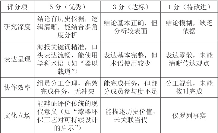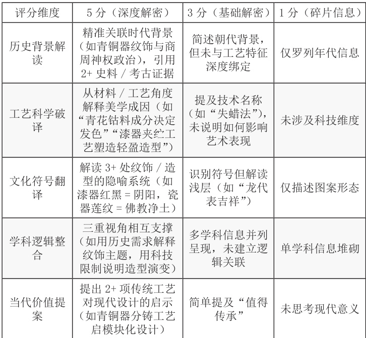 此评价表通过四个维度呈现了文化理解的认知 - →表达→协作→思辨的认知规律。“研究深度”的量化要求“多角度分析”直指文化复杂性的核心,3 分“表面分析”和 1 分“缺乏依据”形成清晰梯度。比如学生分析青铜器纹饰,若能从礼制、图腾信仰、铸造技术三角度展开(多角度),就比单纯说“好看”(表面)更能体现深度理解。在“表达呈现”维度中,“学科术语使用”这个内容指向了文化理解的专业性。比如学生能用“器以载道”而非“古人把想法放在器物上”,说明真正内化了传统造物哲学。量化标准迫使学生在表达中主动调用专业词汇,深化概念认知。“协作效率”维度评价看似与文化内涵无关,实则保障了深层讨论的可能,高效协作的小组才有时间争论“漆器纹样是巫术符号还是审美装饰”这类深度问题。“文化立场”维度是通过结合其他学科能否辩证看待传统工艺中的阶级性(如青铜器象征权力但也压迫奴隶),这能推动学生超越表面赞美,真正深度理解文化的复杂性。