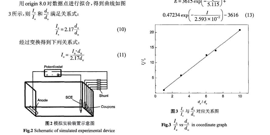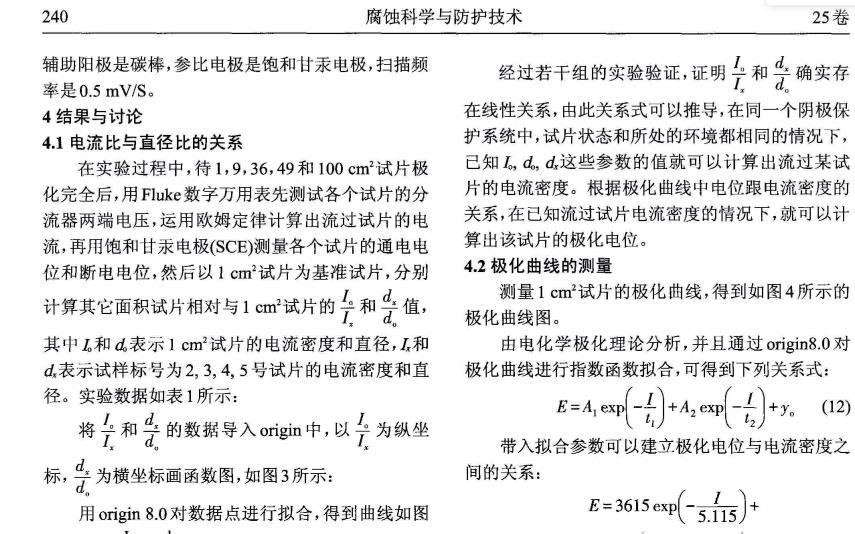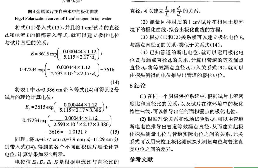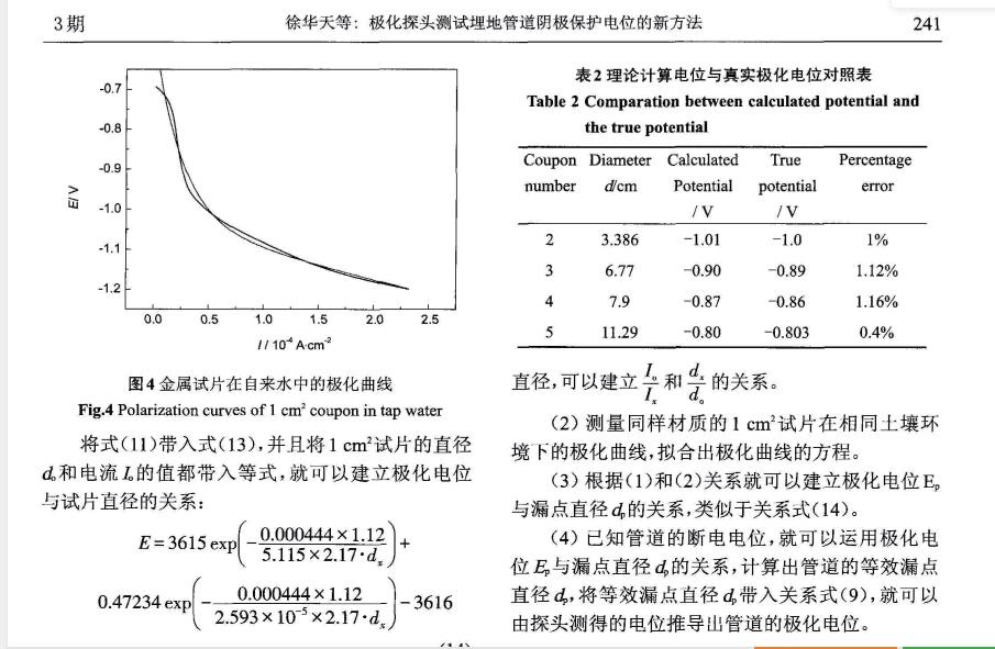 (1) 在同 -- 个阴极保护系统中 , 根据试片电流密度比和直径比的关系,以及试片在该环境中的极化特性曲线, 可以推导出任何面积漏点的极化电位。(2)根据理论关系和现场试验数据,可以由管道断电电位推导出管道等效漏点直径,从而建立起极化探头测量电位与管道实际电位之间的关系,此关系式可以用来校正极化测试探头测量电位与管道真实电位之间的差异。