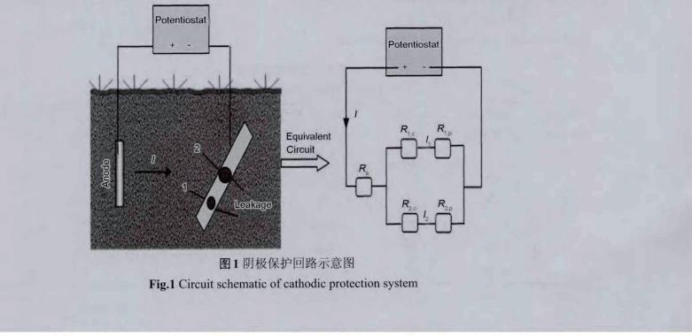 在阴极保护系统中,阴极保护电流主要是从涂层漏点中流入,引起漏点的极化 , 不同漏点之间是并联关系 ", 如图 1 所示 , 左侧为管道阴极保护原理图,右侧为管道上不同涂层漏点的等效电路图。