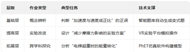 基于学情诊断结果,采用“基础巩固层( (60%)+ 能力拓展层( 30% )+ 创新探究层(10%)”的三阶模型设计作业。在“牛顿第二定律”单元中,学困生需完成“控制变量法操作步骤排序”等基础题;中等生需分析“不同表面摩擦力对实验误差的影响”;学优生则需设计“验证动量定理与牛顿第二定律关联性”的探究方案。合肥十中实践显示,该模式使作业完成率从72% 提升至 95% 。