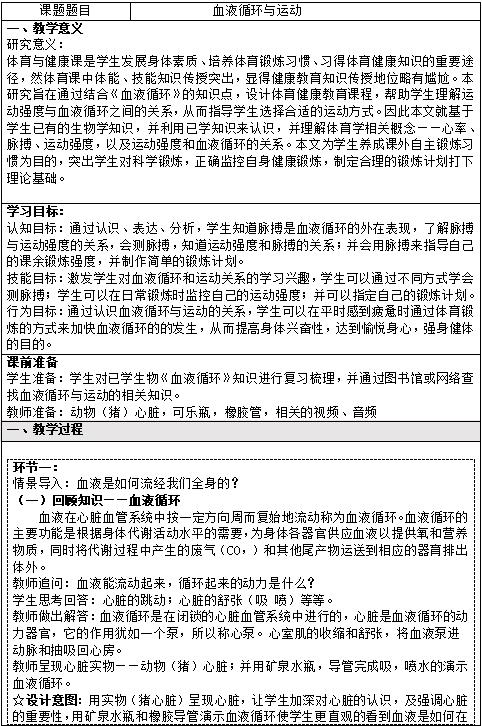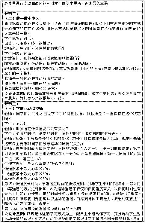 案例呈现:当下时代学生经常因为病毒、细菌而导致生病发烧、感冒会导致学生上呼吸道感染、肺炎、心肌炎等情况;然而学生在患病后需很长一段时间不能剧烈运动。但是作为初中学生对运动强度的认识还不够,因此可能会出现因大强度的运动导致出现运动伤害事故。为防止学生自主锻炼时发生运动伤害,体育教学中让学生认识、理解并运用运动强度来指导自主安全、科学锻炼是非常有必要的。那么在传统的教学中如果利用体育单一知识传授“运动强度”这个概念,大部分学生都只是听一听,并不会真正的运用到锻炼中去。因此如何创新课堂就成了体育教师的当务之急。体育跨学科教学带来了这节课的创新点,学生学习初中生物课中讲的血液循环后对加深理解脉搏概念、运动强度概念有重要的意义。那么利用测脉搏和最大心率的概念就可很科学的进行可控的运动强度。这样反映运动强度就显的更为直观,学生也更容易理解。学生借助这些概念就可以更好的指定课余的运动计划。基于此提出体育与生物跨学科教学下学习“认识运动强度”一课。