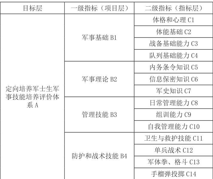 表1 定向培养军士生军事技能培养评价指标体系
