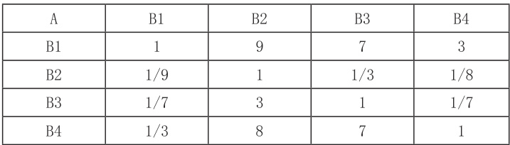 评价体系的指标构建后,首先要确定每一层要素之间和上下层要素之间的权重值,采用 Saaty1-9 标度来进行排列,根据 Saaty1-9 标度来体现各个指标之间的相对重要程度,从而形成一个判断矩阵。通过咨询专家组对专家意见进行整理和分析,对项目层形成判断矩阵 RA-B. ,具体见表2