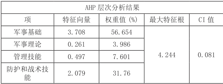 该判断矩阵的含义为军事基础相比军事理论强烈重要、相比管理技能极其重要、相比防护和战术稍重要;管理技能相比军事理论稍重要;防护和战术相比军事理论介于极其重要和强烈重要之间、相比管理技能极其重要。