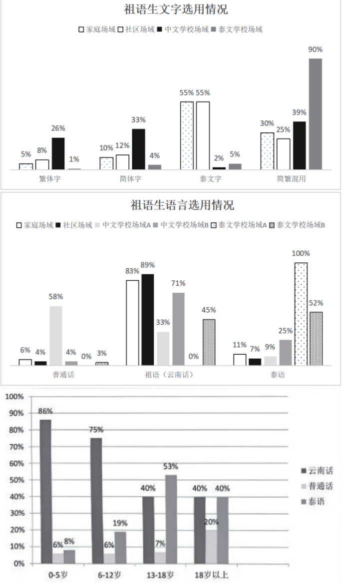 学校作为重要的语言社会化场域,其语言使用特征能够有效反映学生的语言态度和祖语保持状况。研究选取泰北云南华人村典型的教育体系为观察对象,该体系主要由正规的泰文学校和非正式的村办中文学校构成二元结构。其中,中文学校作为社区自发的文化教育机构,虽未被纳入国家主流教育体系,但在中华文化传承方面发挥着关键作用。中文学校语言使用调查显示学生之间交流71% 使用云南话,25% 使用泰语,4% 使用普通话;而与教师交流 58% 使用普通话,33% 使用云南话,9% 使用泰语。文字使用则呈现多元化特征, 39% 简繁混用,33% 使用简体字, 26% 使用繁体字,仅2% 使用泰文字。这一现象表明,学生在非正式场合倾向于使用母语云南话,而在正式教学场景则遵循学校规定使用普通话。文字使用中的简繁混用现象,主要源于学校同时采用大陆简体字和台湾繁体字两种教学体系。泰文学校的调查数据呈现不同特征。学生间交流时,52% 使用泰语,45% 使用云南话, 3% 使用普通话;师生交流则完全使用泰语。文字使用方面,90% 使用泰文字,9% 简繁混用,仅 1% 使用繁体字。该结果清晰展现了语言环境对语言选择的显著影响,在泰文主导的教学环境中,学生自然倾向于使用泰语进行交流,但仍保留相当比例的母语使用。文字选择则明显倾向于更为简便的泰文字书写系统。