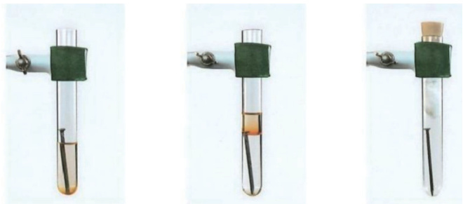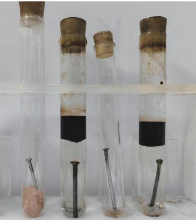 笔者在担任化学老师的同时,有几年还兼职化学实验员,每次准备这个实验时,都是严格按照教材上的要求,先把蒸馏水煮沸来完成实验,尤其是上图中第二支试管,在煮沸的蒸馏水中加入洁净的铁钉,封上植物油。在完成课堂演示实验后,有时没有及时清理,过一阵就会发现,第三支试管(即装有干燥剂)中铁钉不生锈,第一支试管中铁钉同时接触蒸馏水和空气,生锈明显,第二支试管中铁钉(只接触蒸馏水,上覆植物油)也会生锈,无论之前的操作多么规范,铁钉上的锈迹还是越来越明显,让笔者百思不得其解。